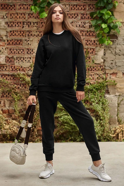 Костюм женский повседневный, спортивного стиля из комфортной ткани (футера), состоящий из свитшота и брюк. Свитшот свободного силуэта (слегка оверсайз), с рукавами покроя реглан с притачной манжетой по низу. Вышивка – логотип в левой части переда в цвет ткани. Рукава длинные с притачной манжетой по низу. Брюки с притачным поясом, резинкой и шнурком внутри. Передняя половинка брюк с боковыми карманами. По низу брюк – притачные манжеты.Футер 3-нитка диагональ (без начёса) качества пенье.