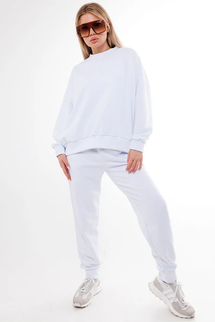 Нежный женский повседневный костюм, стиля athleasure пошит из комфортной ткани (футера 3-нитки петельного качества пенье) Состоит из свитшота и брюк. Свитшот — покроя оверсайз имеет спущенную линию плеча и слегка удлиненную спинку относительно переда. Бейка горловины, манжеты рукавов и низ брюк пошит из ткани-компаньена кашкорсе. По центру переда свитшота вышит логотип в цвет ткани. Брюки с притачным поясом, резинкой внутри. Передняя половинка брюк с боковыми карманами. По низу брюк – притачные манжеты.. Футер 3-нитка диагональ (без начёса) качества пенье.