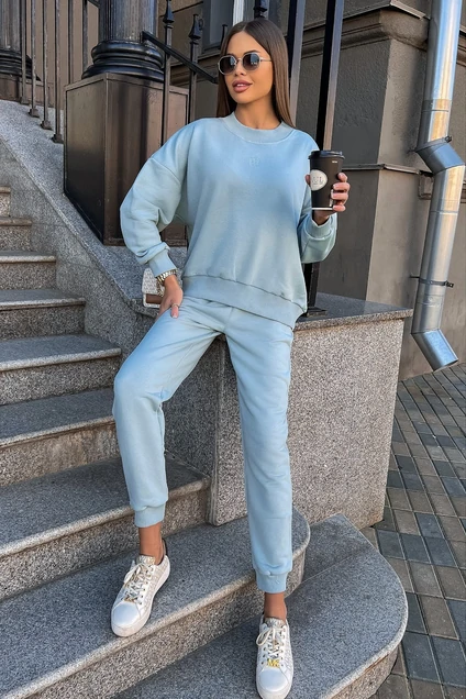 Нежный женский повседневный костюм, стиля athleasure пошит из комфортной ткани (футера 3-нитки петельного качества пенье) Состоит из свитшота и брюк. Свитшот — покроя оверсайз имеет спущенную линию плеча и слегка удлиненную спинку относительно переда. Бейка горловины, манжеты рукавов и низ брюк пошит из ткани-компаньена кашкорсе. По центру переда свитшота вышит логотип в цвет ткани. Брюки с притачным поясом, резинкой внутри. Передняя половинка брюк с боковыми карманами. По низу брюк – притачные манжеты.Футер 3-нитка диагональ (без начёса) качества пенье.