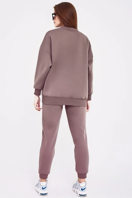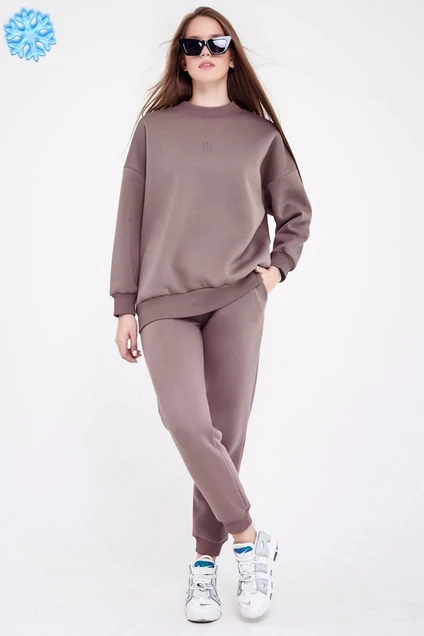 Женский тёплый оверсайз костюм спортивного стиля. Пошит комфортной ткани (футера 3-нитки с начёсом качества пенье). Костюм состоит из свитшота и брюк. Свитшот свободного покроя со спущенной линией плеча и длинным рукавом. Горловина, манжеты рукавов и низ свитшота из ткани-компаньена кашкорсе. Перед с вышивкой – логотипом по центру переда в цвет ткани. Брюки с притачным поясом, резинкой внутри. Передняя половинка брюк с боковыми карманами. По низу брюк – притачные манжеты.