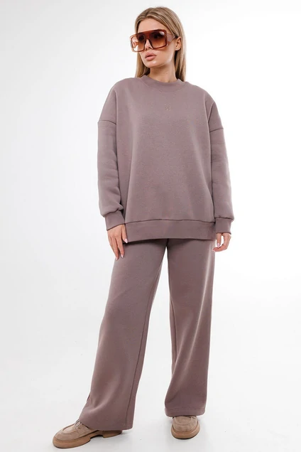 Женский тёплый оверсайз костюм спортивного стиля. Пошит комфортной ткани (футера 3-нитки с начёсом качества пенье). Костюм состоит из свитшота и брюк. Свитшот свободного покроя со спущенной линией плеча и длинным рукавом. Горловина, манжеты рукавов и низ свитшота из ткани-компаньена кашкорсе. Перед с вышивкой – логотипом по центру переда в цвет ткани. Брюки прямые, с карманами на передних половинках, внутри пояса резинка.