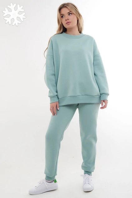 Женский тёплый оверсайз костюм спортивного стиля. Пошит комфортной ткани (футера 3-нитки с начёсом качества пенье). Костюм состоит из свитшота и брюк. Свитшот свободного покроя со спущенной линией плеча и длинным рукавом. Горловина, манжеты рукавов и низ свитшота из ткани-компаньена кашкорсе. Перед с вышивкой – логотипом по центру переда в цвет ткани. Брюки с притачным поясом, резинкой внутри. Передняя половинка брюк с боковыми карманами. По низу брюк – притачные манжеты.