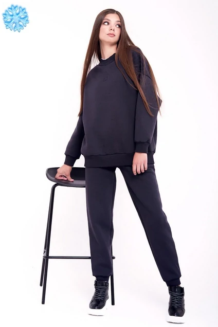 Женский тёплый оверсайз костюм спортивного стиля. Пошит комфортной ткани (футера 3-нитки с начёсом качества пенье). Костюм состоит из свитшота и брюк. Свитшот свободного покроя со спущенной линией плеча и длинным рукавом. Горловина, манжеты рукавов и низ свитшота из ткани-компаньена кашкорсе. Перед с вышивкой – логотипом по центру переда в цвет ткани. Брюки с притачным поясом, резинкой внутри. Передняя половинка брюк с боковыми карманами. По низу брюк – притачные манжеты.