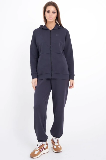 Стильный женский костюм спортивного стиля покроя оверсайз. Пошит из комфортной всесезонной ткани (петельного футера 3-нитки высшего качества пенье). Манжеты рукавов, планка по низу изделия, пояс брюк выполнен из ткани-компаньона кошкорсе в цвет основной ткани. Джемпер с цельнокроенным рукавом и двойным капюшоном. Застежка — молния по центру. На переде выполнены модельные треугольные резы. Удобные карманы в нижней части полочки, вышивка — логотип на левом стороне в цвет ткани. Брюки свободные, зауженные c резинками по низу. Боковые карманы на передних половинках брюк. Пояс с резинкой внутри.Футер 3-нитка диагональ (без начёса) качества пенье.
