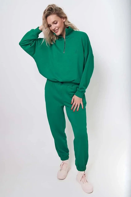 Стильный женский костюм спортивного стиля покроя оверсайз. Пошит из комфортной всесезонной ткани (петельного футера 3-нитки высшего качества пенье). Костюм состоит из свитшота и брюк. Свитшот свободного кроя со спущенной линией плеча и длинным рукавом. По центру переда короткая застежка-молния, переходящая в стойку. Низ свитшота дополнен кулисой и шнуром внутри для фиксации ширины изделия на уровне талии. Стойка, манжеты рукавов выполнены из ткани-компаньена кашкорсе. Слева на переде свитшота вышит логотип в цвет ткани. Брюки свободного прилегания, заужены к низу. Имеют притачной пояс с резинкой внутри, боковые карманы на передних половинках. Низ брюк присобран на резинку.Футер 3-нитка диагональ (без начёса) качества пенье.