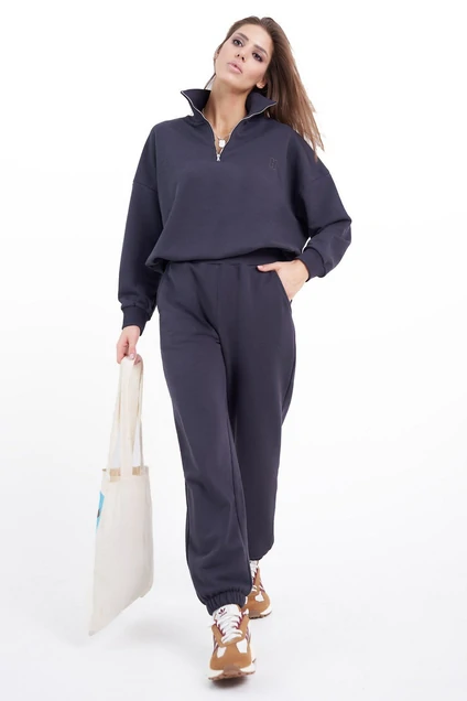 Стильный женский костюм спортивного стиля покроя оверсайз. Пошит из комфортной всесезонной ткани (петельного футера 3-нитки высшего качества пенье). Костюм состоит из свитшота и брюк. Свитшот свободного кроя со спущенной линией плеча и длинным рукавом. По центру переда короткая застежка-молния, переходящая в стойку. Низ свитшота дополнен кулисой и шнуром внутри для фиксации ширины изделия на уровне талии. Стойка, манжеты рукавов выполнены из ткани-компаньена кашкорсе. Слева на переде свитшота вышит логотип в цвет ткани. Брюки свободного прилегания, заужены к низу. Имеют притачной пояс с резинкой внутри, боковые карманы на передних половинках. Низ брюк присобран на резинку.Футер 3-нитка диагональ (без начёса) качества пенье.
