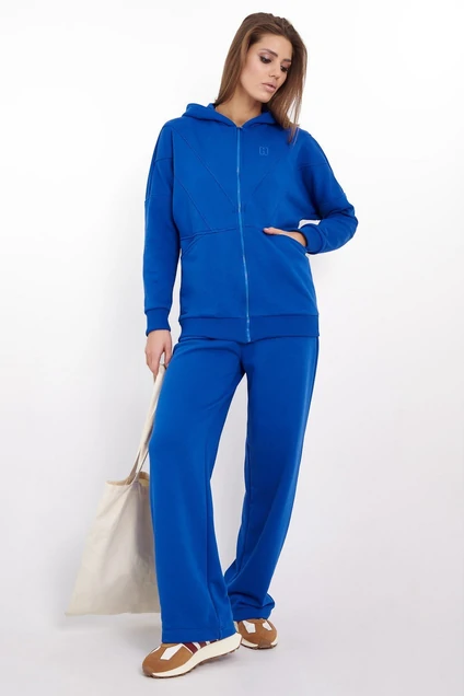 Стильный женский костюм спортивного стиля, свободного кроя, состоящий из брюк и джемпера. Манжеты рукавов, планка по низу изделия, пояс брюк выполнен из ткани-компаньона кошкорсе в цвет основной ткани. Джемпер с цельнокроенным рукавом, двойным капюшоном и с застежкой — молнией по центру. Перед с модельными треугольными резами, с удобными карманами в нижней части и с вышивкой- логотипом на левом стороне в цвет ткани. Брюки свободные расширенные. На передней половинке выполнены удобные боковые карманы. Пояс с резинкой внутри.Футер 3-нитка диагональ (без начёса) качества пенье.