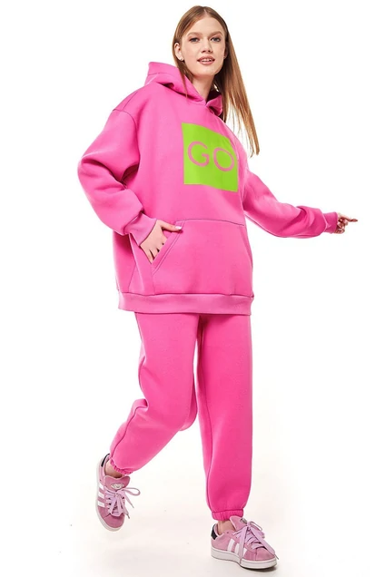 Женский тёплый уютный костюм. Подойдет для прогулок и отдыха. Изготовлен из футера с начесом, состоит из худи, покроя оверсайз и джоггеров. Худи имеет двойной капюшон и карман кенгуру. По центру переда контрастная печать GO. Рукава имеют притачную манжету. Манжеты рукавов и низ изделия выполнены из ткани- компаньона кошкорсе. Брюки немного зауженные и низ присобран на резинку. Передние половинки имеют удобные карманы. Пояс с резинкой и шнурком внутри. Пояс выполнен из кошкорсе.