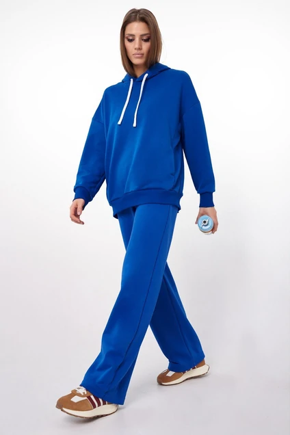 Женский, повседневный костюм, спортивного стиля, состоящий из оверсайз худи и прямых брюк. Пошит из комфортной всесезонной ткани (петельного футера 3-нитки). Худи имеет прямой силуэт со спущенной линией плеча притачной планкой снизу. На переде, в рельефных швах худи — удобные карманы. Капюшон с кулисой по краю и шнурком внутри. Рукав с манжетой (из ткани компаньона — кашкорсе). По центру переда — вышивка-логотип в цвет изделия. Брюки прямые от линии бедер, с карманами на передних половинках и резинкой внутри пояса.Футер 3-нитка диагональ (без начёса) качества пенье