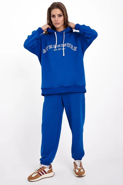 Стильный, современный, удобный костюм, состоит из худи и джоггеров. Худи имеет oversize покрой. На переде дизайнерская, контрастная вышивка “athleisure”. Athleisure — это сочетание двух слов athletics и leisure, что означает «спорт» и «досуг». Этот стиль помогает гармонично вписать спортивную одежду в повседневный гардероб. Худи с длинным рукавом, с капюшоном и кулисой со шнуром внутри, в цвет вышивки. Манжеты рукавов и низ выполнены из ткани-компаньена кошкорсе в цвет ткани. Брюки имеют современный крой и облегание, удобные карманы на передних половинка, притачной пояс и резинку внутри. Низ брюк присобран на резинку.Футер 3-нитка диагональ (без начёса) качества пенье.