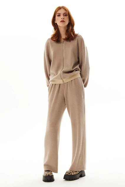 Блузон с центральной застежкой на молнию, с отрезной стойкой. Плечо спущенное. Рукав втачной, длинный, с отрезной манжетой. Низ блузона с отрезным поясом. Брюки прямые, с отрезным поясом. Пояс присборен на резинку. В боковых швах расположены карманы. Тип ткани: трикотажный, костюмно – плательный.