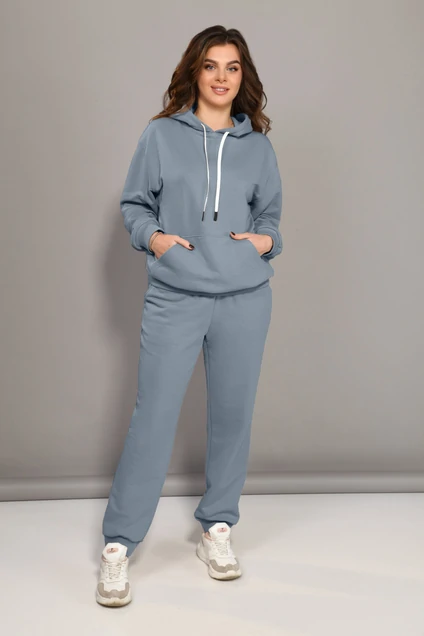 Костюм женский спортивный, состоящий из худи и брюк-джогеров, выполненный из трикотажного полотна "футер" 3-х нитка, петля-пенье. Худи прямого свободного силуэта, с двойным капюшоном, спущенной линией плеча, длинным рукавом и карманом "кенгуру" по переду. Низ рукава и худи обработан манжетой из кашкорсе в цвет изделия. Спинка без конструктивных элементов. Брюки-джогеры с поясом на резнике и шнурком, в боковых швах карманы, низ брюк на манжете из кашкорсе. Длина рукава 60см, длина худи 70см, длина брюк с поясом 105см.