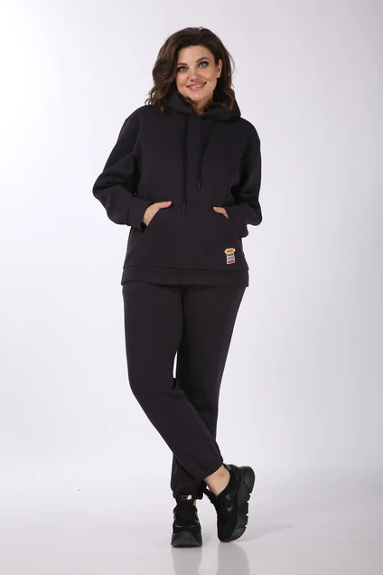 Костюм женский спортивный, состоящий из худи и брюк-джоггеров, выполненный из трикотажного полотна "футер" 3-х нитка-начес. Худи прямого свободного силуэта, с двойным капюшоном, спущенной линией плеча, длинным рукавом и карманом "кенгуру" по переду. Низ рукава и худи обработан манжетой из основной ткани. Спинка без конструктивных элементов. Брюки-джоггеры с поясом на резнике, в боковых швах карманы, низ брюк на резинке. Длина рукава 60см, ширина плеча 17см, длина худи 66см, длина брюк с поясом 106см. Декоративные элементы могут быть изменены.