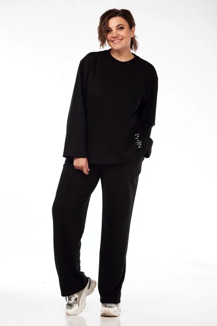 Костюм женский, состоящий из джемпера и брюк прямого свободного силуэта, изготовленный из трикотажного полотна (футер 3-х нитка петля). Джемпер прямого свободного силуэта со спущенной линией плеча, округлым вырезом горловины, по боковым швам - разрезы, внизу декоративная печать. Рукава втачные, прямые. Спинка джемпера без конструктивных изменений. Линия низа спинки длиннее линии низа переда на 8см. Брюки прямого свободного силуэта с высокой посадкой и наклонными карманами в боковых швах. Пояс брюк на широкой резинке. По переднему полотнищу брюк – отделочная строчка, которая вытягивает силуэт. Длина джемпера - 74см, длина рукава - 57см, ширина плеча - 16см, длина брюк - 112см (с учетом ширины пояса 5см)