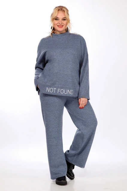 Комплект брючный 2-х предметный изготовлен из трикотажного полотна. Джемпер свободного силуэта, горловина обработана воротником – стойка. Низ переда с широкой планкой, декорированной печатью. Спинка цельнокроенная. В боковых швах обработаны карманы. Рукав спущенный, длинный. Брюки средней посадки, пояс на резинке дополнен шнуром. Брюки прямого покроя.