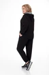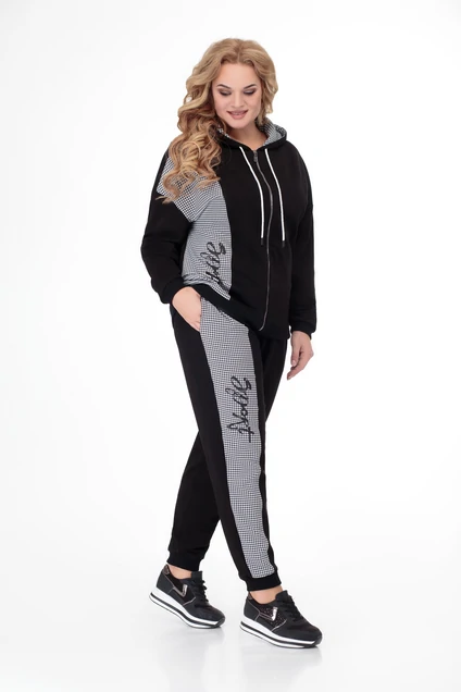 Костюм выполнен из комфортного трикотажного полотна состоит из джемпера и брюк. Джемпер прямого силуэта, со спущенным плечом. На правой полочке рельеф из отделочной ткани в клетку, выходящий из плечевого шва, декорирован принтом. Спинка стачная. Рукав втачной, одношовный. По низу джемпера и рукавов - довязы. Горловина оформлена капюшоном, внутренняя часть которого из отделочной ткани, в поддержку рельефа. В отлете капюшона - декоративный шнур. Брюки прямого силуэта, слегка зауженные к низу. Правая половинка комбинированная с отделочной тканью, в поддержку джемпера, которая декорирована принтом. В боковых швах обработаны карманы. Верхний срез брюк оформлен поясом с эластичной тесьмой. По низу брюк – манжеты.