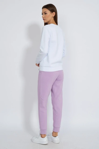 Костюм утепленный на флисе. Свитшот с принтом либо отделкой по переду. Брюки модели средней посадки зауженные к низу с карманами в боковых швах. Обработка низа брюк манжета. Ткань футер (3-х ниточный) с внутренним слоем утепленным начесом, качество Пенье, плотность 380 г.м2