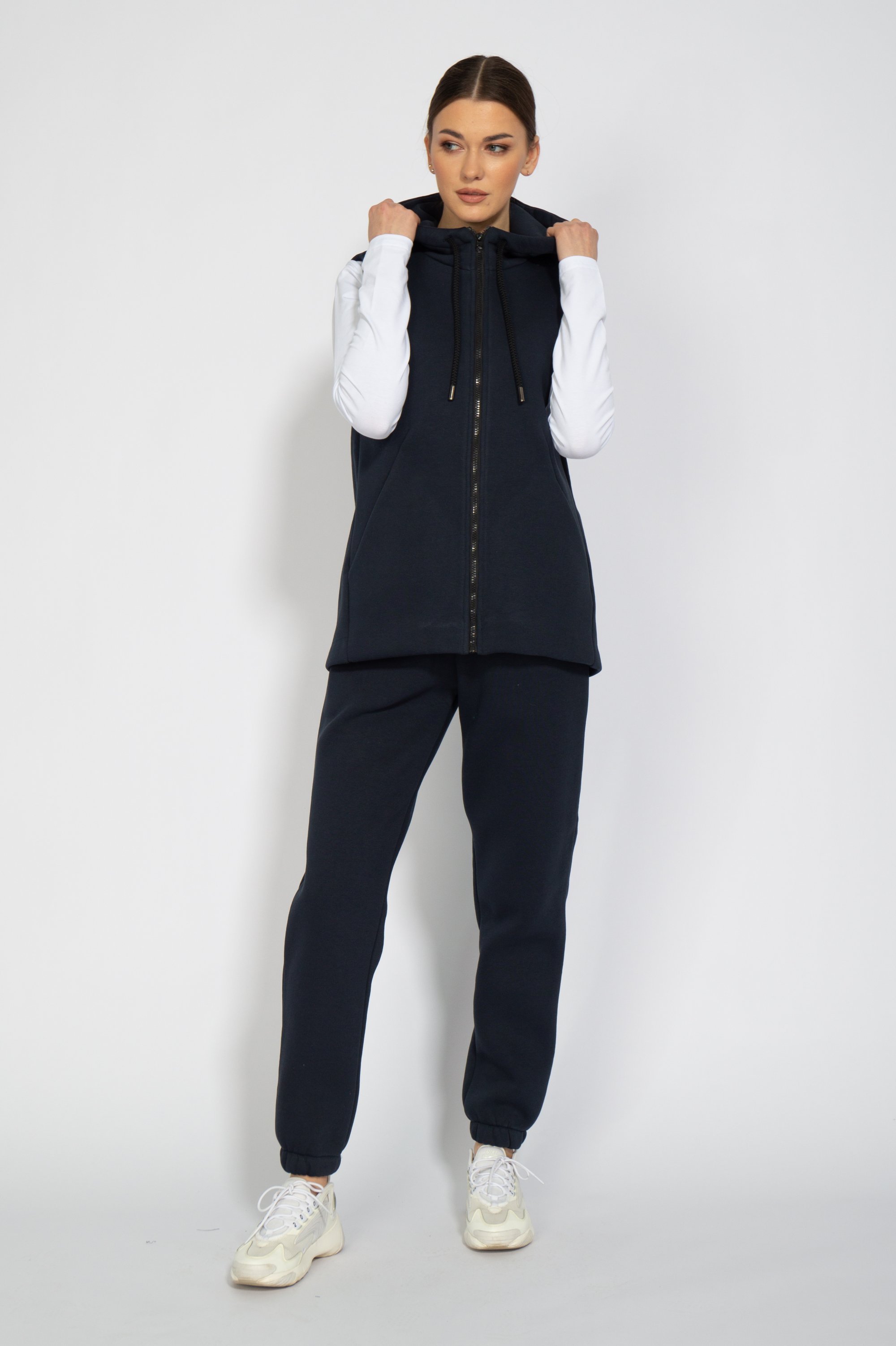 Костюм утепленный на флисе. Жилетка из футера с начесом на подкладке из натурального хлопка модели 4060 с капюшоном, с карманами. Брюки модели 4053 средней посадки зауженные к низу с карманами в боковых швах. Обработка низа брюк резинка. Ткань футер (3-х ниточный) с внутренним слоем утепленным начесом, качество Пенье, плотность 395 г.м2