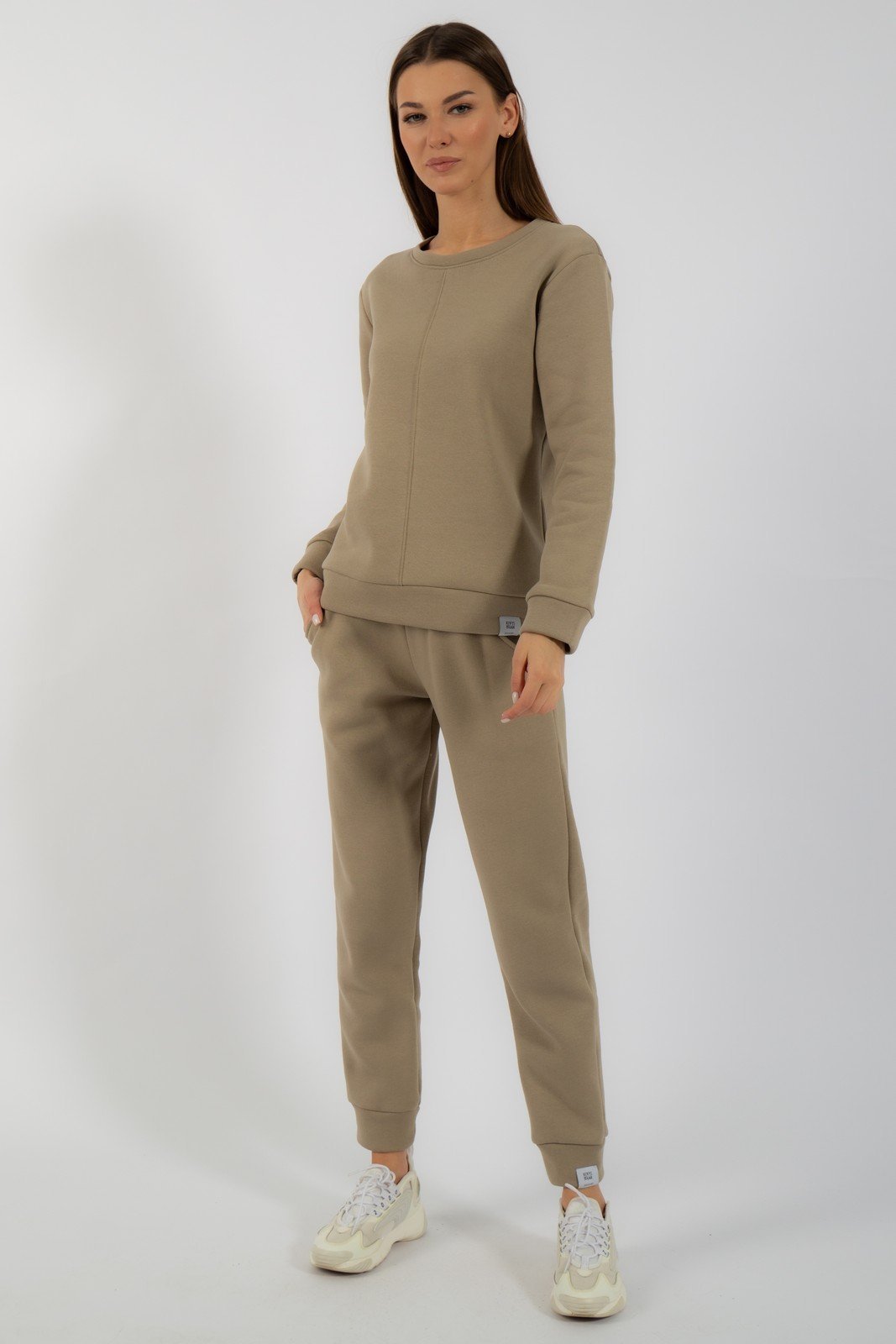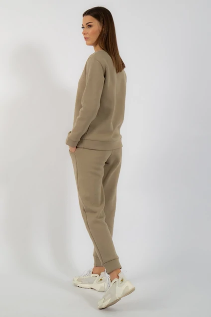 Костюм утепленный на флисе. Свитшот с принтом либо отделкой по переду. Брюки модели средней посадки зауженные к низу с карманами в боковых швах. Обработка низа брюк манжета. Ткань футер (3-х ниточный) с внутренним слоем утепленным начесом, качество Пенье, плотность 380 г.м2