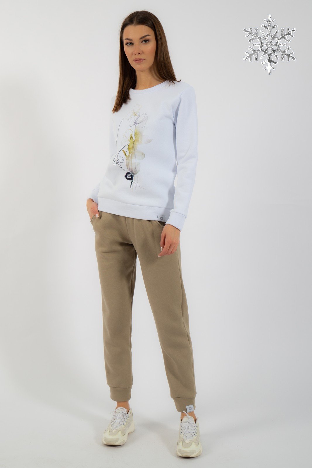 Костюм утепленный на флисе. Свитшот с принтом либо отделкой по переду. Брюки модели средней посадки зауженные к низу с карманами в боковых швах. Обработка низа брюк манжета. Ткань футер (3-х ниточный) с внутренним слоем утепленным начесом, качество Пенье, плотность 380 г.м2