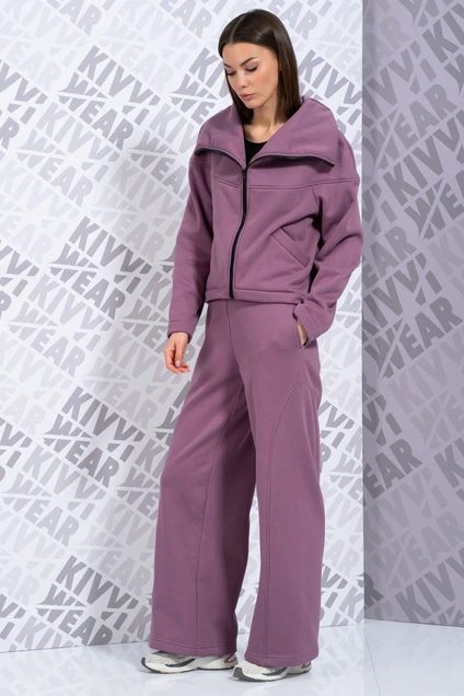 Брюки слегка расширены к низу, что придает им элегантность и легкость. Брюки имеют карманы в боковых швах, где вы можете удобно хранить мелкие вещи. Кокетка по спинке подчеркивает линию талии и делает силуэт более изящным. Брюки выполнены из трехниточного футера с изнанкой на флисе премиального качества, который обеспечивает тепло и мягкость.