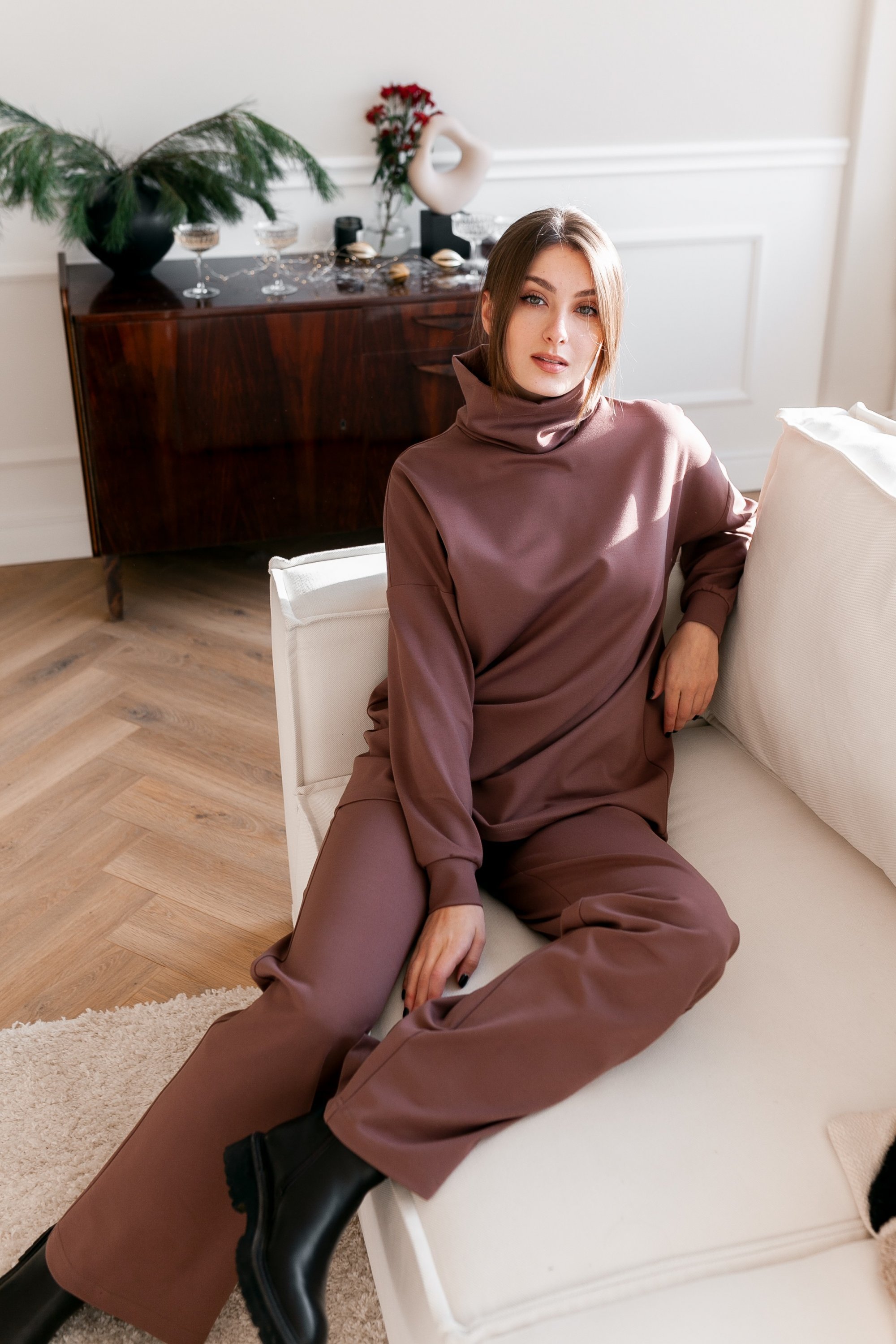 Стильный трикотажный костюм: свободный свитер оверсайз с высоким воротом и брюки палаццо на резинке.