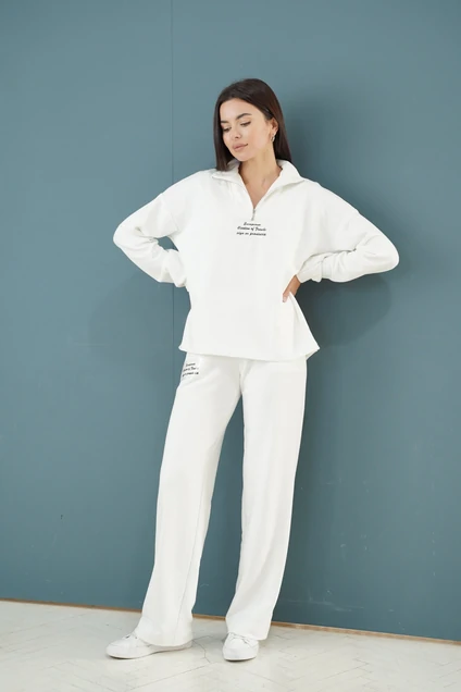Костюм свитшот и брюки изготовлен из трикотажного полотка. Свитшот прямого силуэта. Полочка с кокеткой по центру, застёгивающейся на декоративную молнию. Воротник стойка. Линия плеча расширена. Рукав рубашечный на манжете. Брюки прямые, с карманами в боковом шве. Пояс брюк на резинке. Длина кофты по спинке 62 см. Длина спуска рукава 16 см. Длина рукава от спуска 56 см. Длина брюк 105 см.