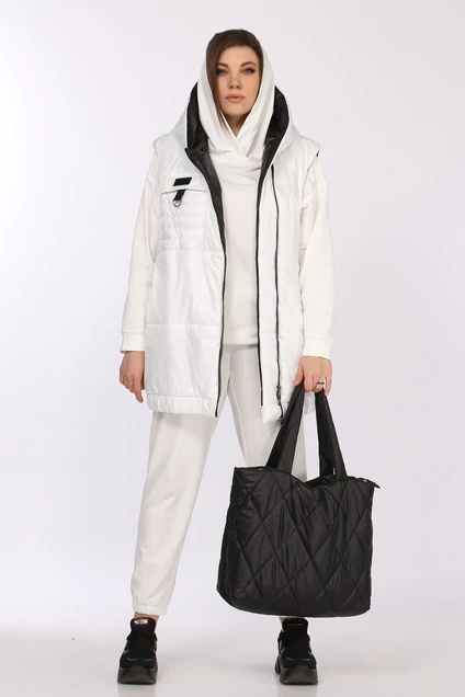 Стильный спортивный комплект тройка. Удлиненный стеганный жилет свободного силуэта с капюшоном и со смещенной застежкой-молнией, прорезные карманы, в рельефных швах на кнопки, по низу эластичный пояс. Утеплитель «ISOSOFT» 120 г. на метр кв. Застежка молния. Большимерит на один размер.