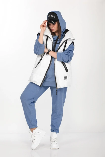 Стильный спортивный комплект тройка. Жилет свободного силуэта с капюшоном на стойке из водоотталкивающей ткани , уникальный бельгийский утеплитель «ISOSOFT» 100 г. на метр кв. и ветрозащитной мембранной подкладки «Barrier». По полочкам прорезные карманы. Низ жилета при собран на эластичную тесьму. Застежка декор. молния. Джемпер-худи и брюки из трикотажного хлопкового полотна “трехнитка”. Удлинённый джемпер-худи свободного силуэта с капюшоном и прорезными карманами в боковых швах, рукав втачной на спущенной пройме. Брюки свободного силуэта с прорезными карманами в боковых швах, пояс и низ на эластичной ленте со сборкой.