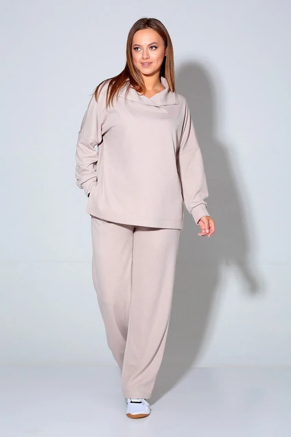 Блузон прямого силуэта со спущенной линией плеча, в боковых швах разрезы. Низ рукава обработан притачной трикотажной манжетой. Горловина в виде воротника с запахом. Брюки прямого кроя. На передних половинках брюк боковые карманы «хулиганы». Верхний срез брюк на притачном поясе на резинке с тесьмой.