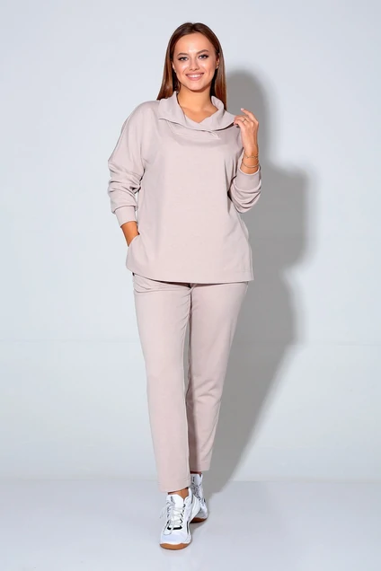 Блузон прямого силуэта со спущенной линией плеча, в боковых швах разрезы. Низ рукава обработан притачной трикотажной манжетой. Горловина в виде воротника с запахом. Брюки зауженные к низу. На передних половинках брюк боковые карманы «хулиганы». Верхний срез брюк на притачном поясе на резинке с тесьмой.