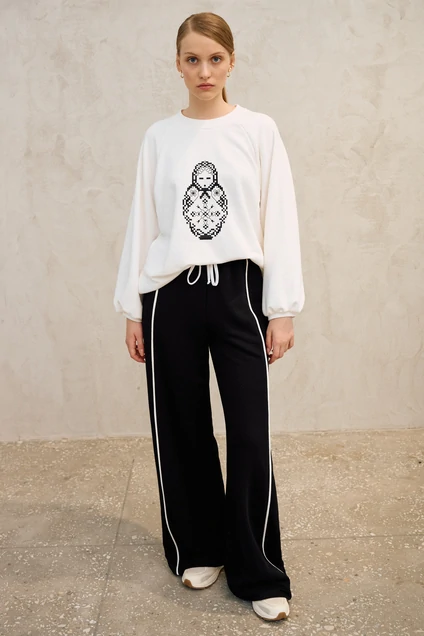 Спортивный костюм выполнен из трикотажного полотна. Худи свободного кроя. Линия плеча спущена, рукав длинный, по низу рукава сборка с притачной планкой. Округлый вырез горловины, планка. По центру худи вышивка, имитирующая ручной стежок. Брюки прямого силуэта, свободного кроя, по поясу резинка и втянут шнур. В боковых швах прорезные карманы. По переду брюк вертикальные подрезы с отделочным кантом.