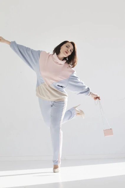 Стильный удобный голубой костюм пастельных тонов, состоит из джемпера и брюк, из мягкого приятного трикотажа . Прямой силуэт свободного прилегания оверсайз.  Перед изделия из резных деталей. Линия плеча спущена, рукав длинный широкий с притачной манжетой на резинке. Воротник высокая стойка.