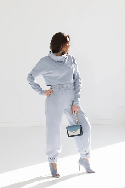 Стильный удобный костюм голубого цвета из мягкого приятного трикотажа. Состоит из джемпера и брюк. Прямой силуэт свободного прилегания. Джемпер из мягкого трикотажа укороченный. Линия плеча спущена, рукав длинный втачной зауженный. Горловина втачная «хомут». Брюки  голубого цвета из мягкого и упругого трикотажа, высокой посадки, широкие прямого свободного силуэта с карманми в боковых швах. Низ брюк на широкой притачной манжете со сборкой. Пояс втачной широкий на резинке в 4 ряда.