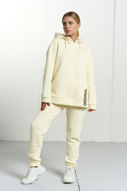 Брюки прямого свободного кроя с боковыми карманами. Пояс брюк -резинка со сборкой. Низ свитшота и брюк на манжетах.