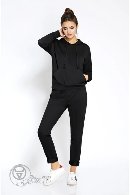 Комплект спортивный из трикотажного полотна. Детали: худи со спущенной линией плеча, рукав втачной на манжете, карман «кенгуру», капюшон с люверсами и шнуром. Брюки на эластичном поясе со шнурами, боковые карманы – «хулиганы», на передних половинах застрочены стрелки-защипы. Длина свитоша – 60 см, длина джоггеров – 104 см