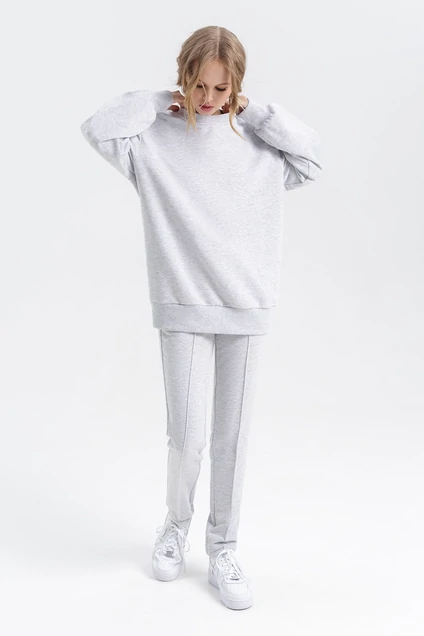 Трикотажный костюм-двойка из свитшота свободного покроя и брюк с защипами. Детали: свитшот прямого силуэта, перед и спинка с широким притачным поясом, спущенная линия плеча, рукава длинные с притачными манжетами. Брюки с высокой посадкой, притачной эластичный пояс, карманы в боковых швах