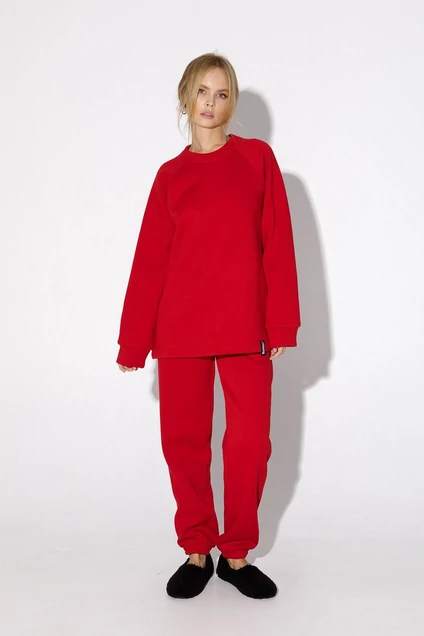 Утепленный трикотажный костюм-двойка из свободного свитшота и брюк-джоггеров. Детали: свитшот свободного покроя, рукава-регланы, круглая горловина переда и спинки, рукава длинные с притачными манжетами, пришивной декор по низу переда. Брюки с высокой посадкой на эластичном поясе, карманы в боковых швах, низ брюк на резинке.