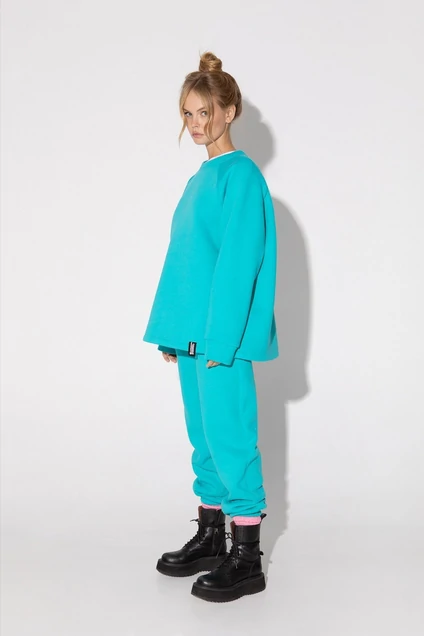 Утепленный трикотажный костюм-двойка из свободного свитшота и брюк-джоггеров. Детали: свитшот свободного покроя, рукава-регланы, круглая горловина переда и спинки, рукава длинные с притачными манжетами, пришивной декор по низу переда. Брюки с высокой посадкой на эластичном поясе, карманы в боковых швах, низ брюк на резинке.