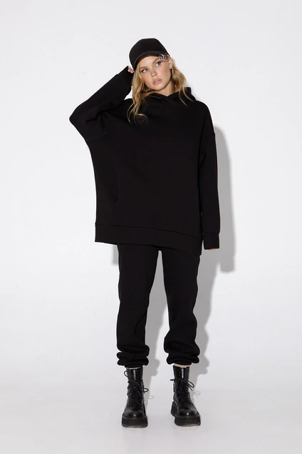 Утепленный трикотажный костюм-двойка из свободного худи и брюк-джоггеров. Детали: худи свободного покроя, спущенная линия плеча, перед с карманами в рельефных швах, капюшон, широкий притачной пояс, рукава длинные с притачными манжетами. Брюки с высокой посадкой на эластичном поясе, карманы в боковых швах, низ брюк на резинке.