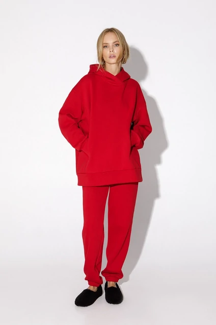 Утепленный трикотажный костюм-двойка из свободного худи и брюк-джоггеров. Детали: худи свободного покроя, спущенная линия плеча, перед с карманами в рельефных швах, капюшон, широкий притачной пояс, рукава длинные с притачными манжетами. Брюки с высокой посадкой на эластичном поясе, карманы в боковых швах, низ брюк на резинке.