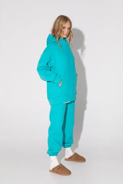 Утепленный трикотажный костюм-двойка из свободного худи и брюк-джоггеров. Детали: худи свободного покроя, спущенная линия плеча, перед с карманами в рельефных швах, капюшон, широкий притачной пояс, рукава длинные с притачными манжетами. Брюки с высокой посадкой на эластичном поясе, карманы в боковых швах, низ брюк на резинке.
