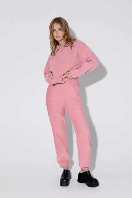 Костюм- двойка в спортивном стиле из свободного джемпера с воротником-поло и брюк-джоггеров из фактурной текстильной ткани в рубчик.
