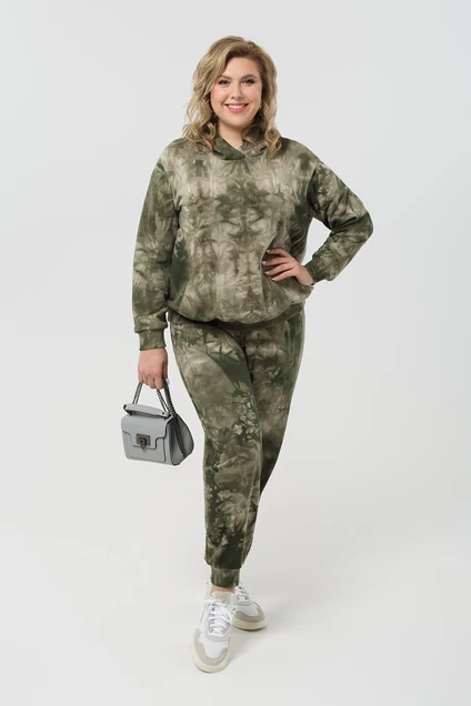 Худи свободного кроя, с притачным поясом из кашкорсе по низу. Рукав втачной, со спущенной линией плеча. По низу рукава есть притачная манжета из кашкорсе. Длина изделия по спинке 71 см. Длина рукава 63 см.