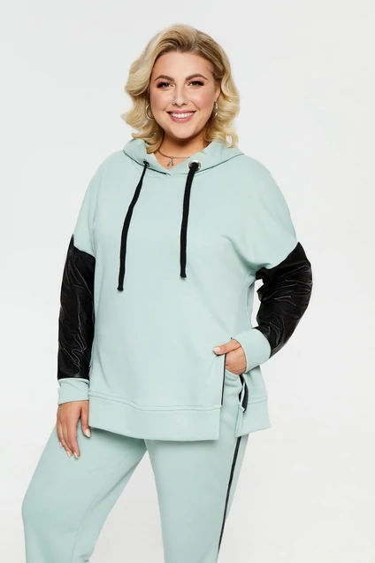 Трикотажный комплект двойка из брюк и худи. По переду худи есть симметричные наклонные рельефы с металлическими короткими молниями в нижней части. По низу изделия притачная деталь в сгиб. Рукава одношовные со спущенной линией проймы. Рукава выполнены из экокожи. По низу притачная манжета. Рукава на подкладке. Капюшон одношовный с люверсами и шнуром. Длина спинки 71 см. Длина рукава 48 см. Брюки на притачном поясе с резинкой и функциональном шнуром. В боковых швах обработаны вставки-лампасы. Спереди есть карманы, а сзади кокетка. Низ брюк на манжетах. Длина сбоку от верха пояса 94 см.