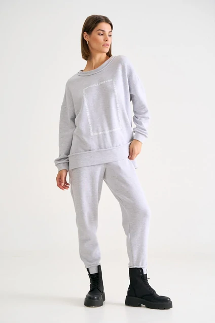 Костюм: джемпер+брюки. Джемпер свободного силуэта со спущенной линией плеча. Рукав на манжете. Низ джемпера с планкой- поясом, спинка длиннее на ширину планки. Горловина округлая с планкой, по переду выполнена дизайнерская печать. Брюки свободного силуэта со спущенной линией сиденья, зауженые к низу и присбореные на манжет, пояс отрезной на широкой резинке, в боковых швах выполнены функциональные карманы.