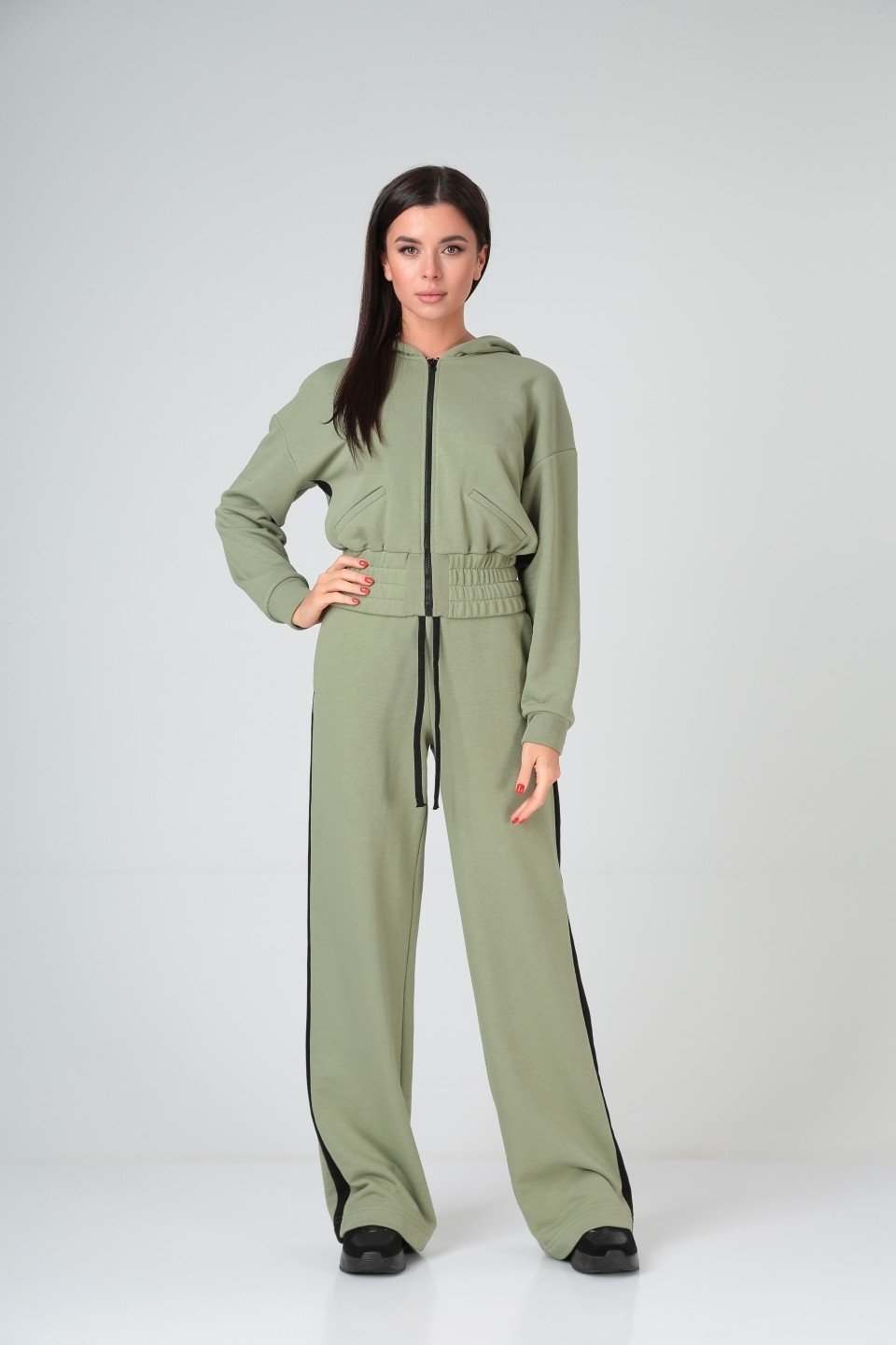 Костюм спорт-шик 2-х предметный. Куртка укороченая с одношовный рукавом на манжете. Плечо спущеное. Низ изделия на резинке. Застежка на молнию. Спинка прямого силуэт. Капюшон двойной свободный.
