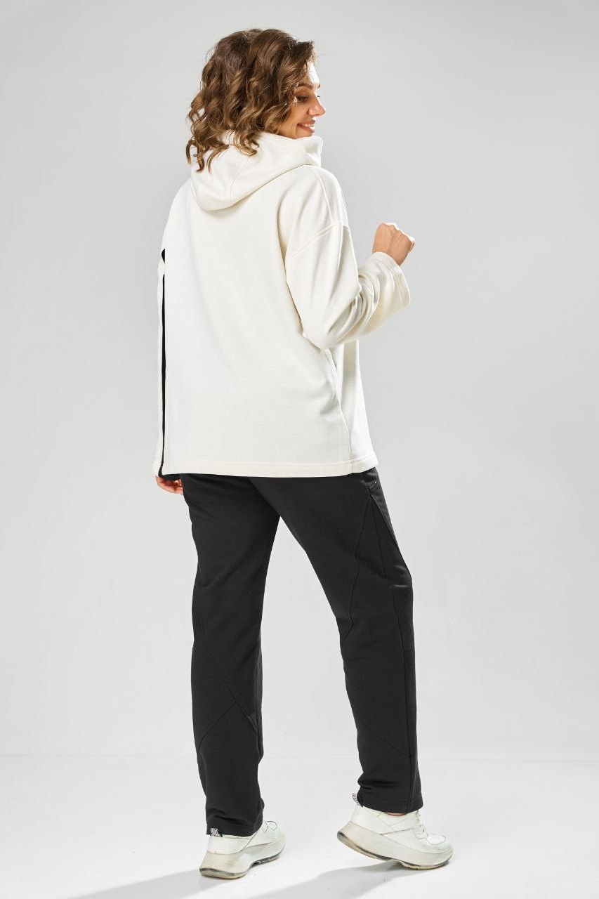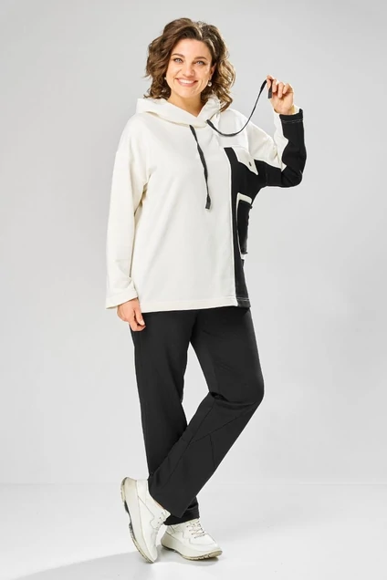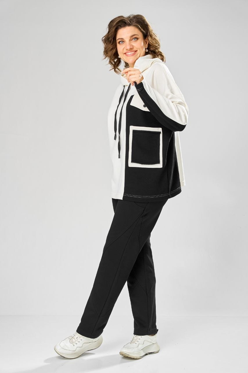 Спортивный костюм 999 белый + черный от Rishelie — это идеальный выбор для повседневной активности. Коллекция бренда предлагает костюм из трикотажного полотна, обеспечивающий комфорт и стиль. Материал из хлопка с добавлением эластана делает комплект мягким и эластичным. Костюм состоит из объемного худи с асимметричным передом, накладным карманом и капюшоном, а также прямых брюк с манжетами и регулируемым шнурком. Двухшовный рукав длиной 7/8 и стильные контрастные ткани добавляют элегантности. Идеально подходит для весны и осени, костюм можно носить как для прогулок, так и для занятий спортом. Белый и черный цвета создают гармоничный и классический образ.