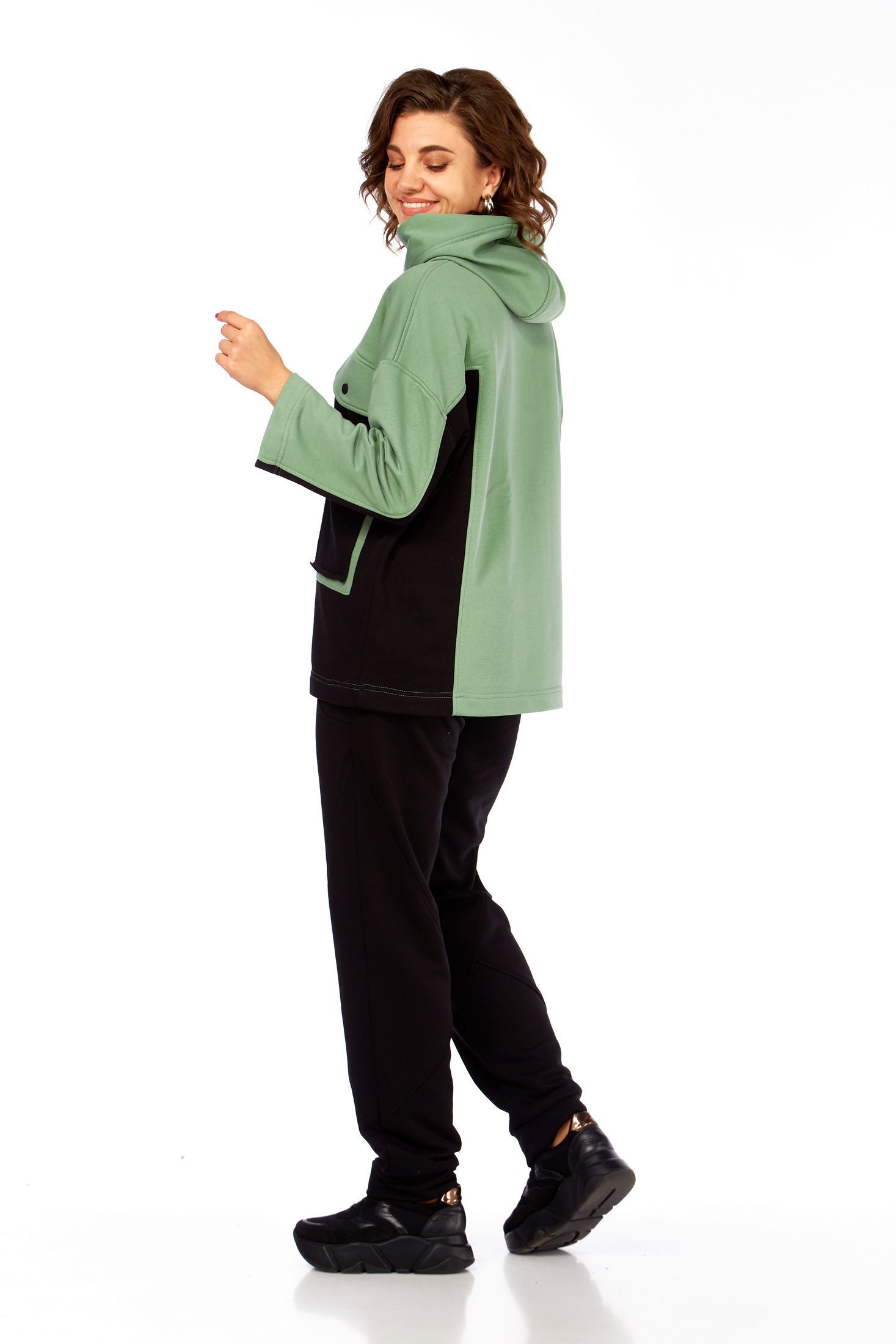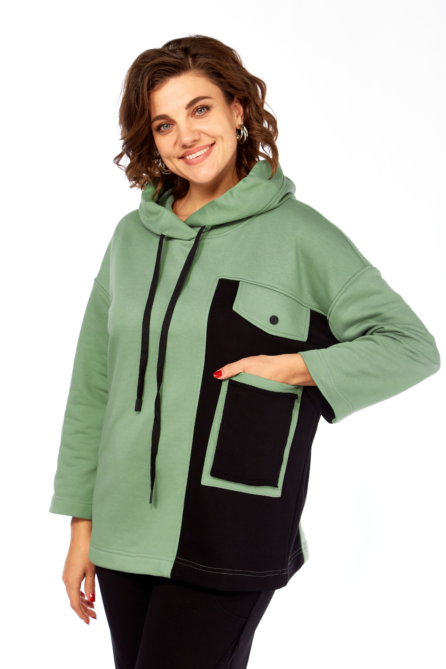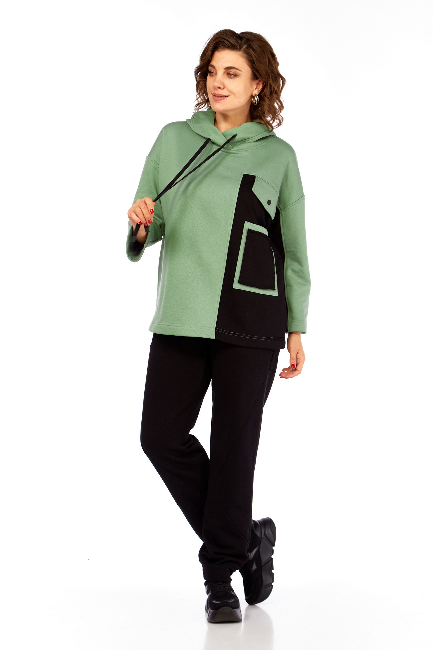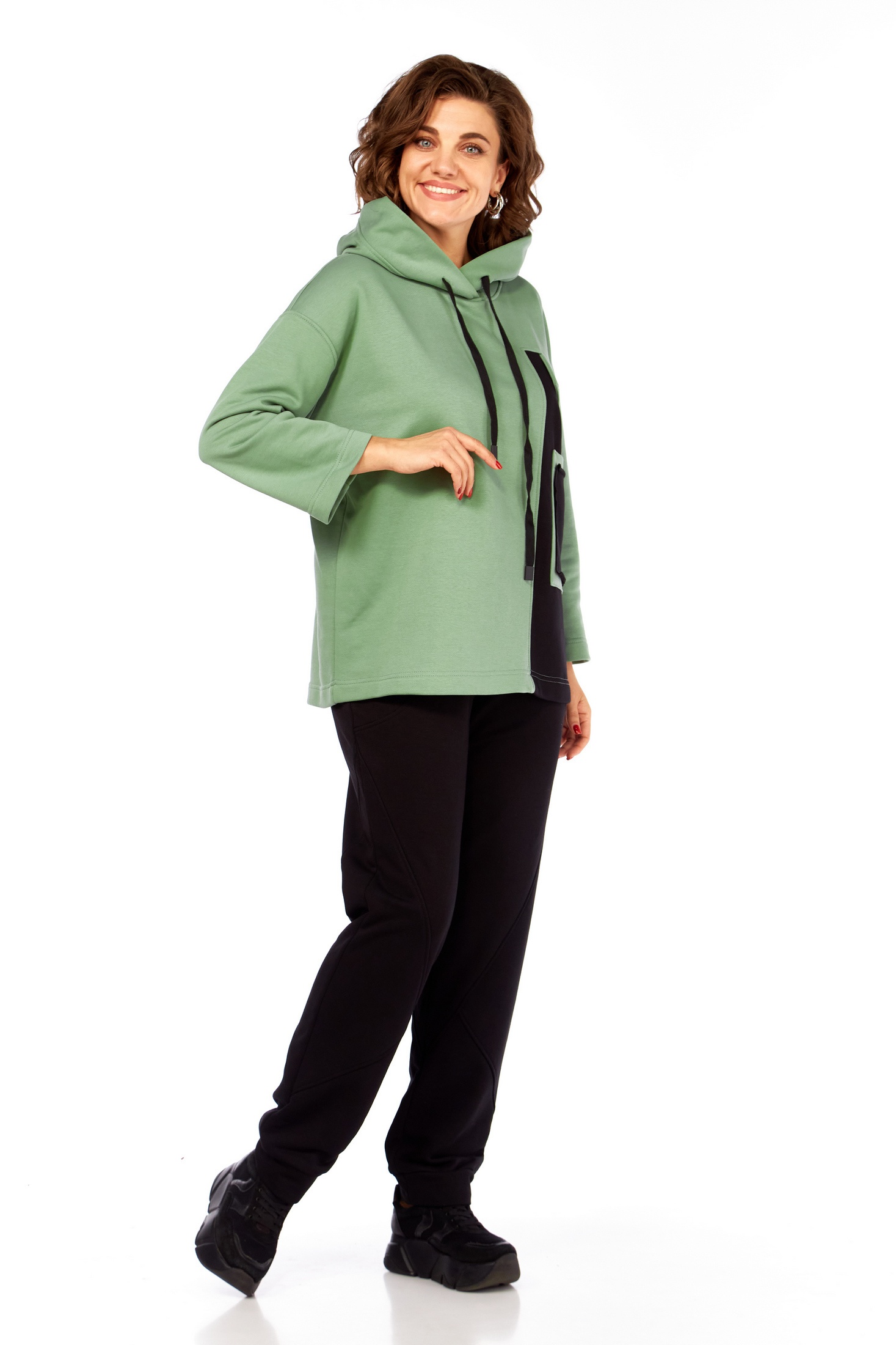 Удобный и практичный повседневный женский комплект в стиле спорт-шик из качественного футера трехнитка. Данная модель состоит из спортивных брюк и объемного худи в сочетании контрастных тканей. Перед ассиметричный с накладным карманом и декоративным клапаном. Горловина оформлена капюшоном. Спинка прямая. Рукав двухшовный со спущенной линией плеча длиной 7/8.