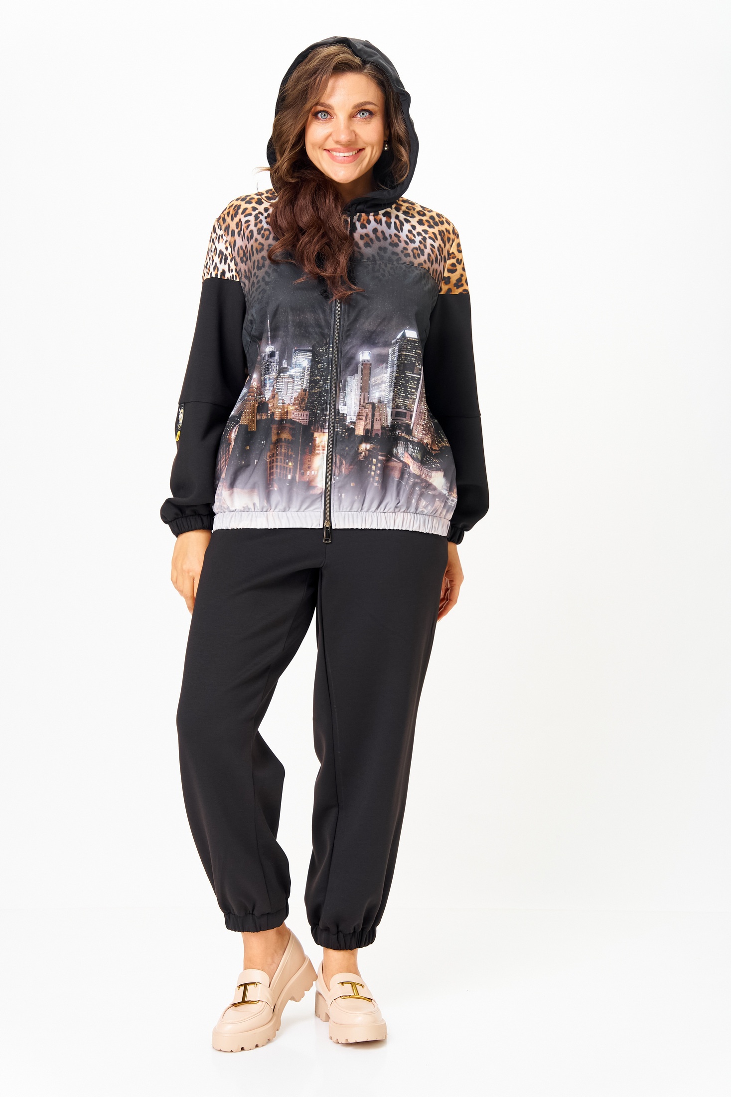 Костюм женский спортивный, состоящий из куртки и брюк. Костюм выполнен из 2-х видов ткани. Куртка с капюшоном свободного кроя на талии с прорезными карманами, застежка молния. Украшением куртки служит деталь из 3D сетки и нашивки на рукаве. Низ рукавов и низ куртки на эластичной манжете. Брюки заужены к низу, с карманами. Брюки на резинке по талии. Низ брюк на манжете с резинкой.
